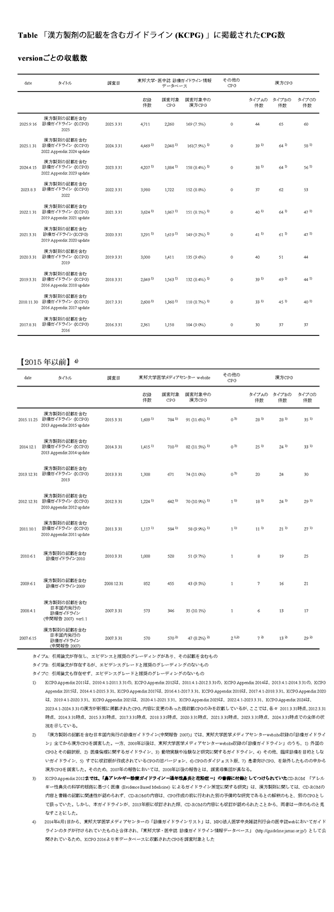 日本東洋医学会EBM 委員会診療ガイドライン タスクフォース (Task Force for Clinical Practice Guidelines: CPG-TF) では、わが国の診療ガイドライン (CPG) の中から漢方製剤に関係する記載を調査し、「漢方製剤の記載を含む診療ガイドライン」(KCPG) として日本東洋医学会のwebsite に公開している。前頁の「version の履歴」にあるように、2023年8月3日に2022年3月31日時点の調査結果をKCPG 2022として報告した。その後、新規発行、改訂されたCPG 中の、漢方製剤に関する記載のみを、2024年4月にKCPG 2022 Appendix 2023 update、2025年1月にKCPG 2022 Appendix 2024 update としてホームページ上に公開した。本年は、「漢方製剤の記載を含む診療ガイドライン 2025」 (KCPG 2025) として、3年ぶりにKCPG を全面改訂することとなった。